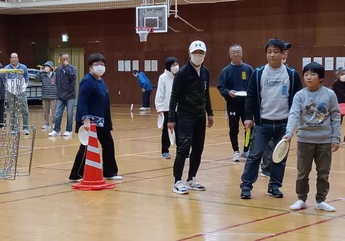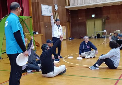 大岡支部では、三世代交流事業として、毎年、小学生親子と高齢者とのフライングディスク大会を開催しています。今年も11月9日(日)大岡小学校をお借りして盛大に開催しました。