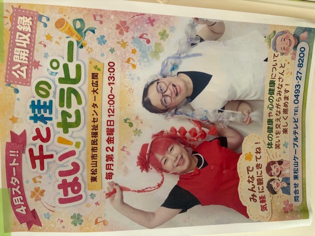 令和8年4月より、毎月第2金曜日・市民福祉センターの大広間にて千と桂さんによる「はい!セラピー」の公開収録が行われます。体と心の健康について、楽しく学べる時間となっています。ご興味のある方、お気軽にお越しください。お待ちしております♪