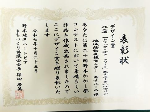 地域活動支援センター「あすみーる」では利用者と職員で一緒に案山子(かかし)を作り、野本かかし祭コンテストに出品したところ、『デザイン賞』を受賞しました👏